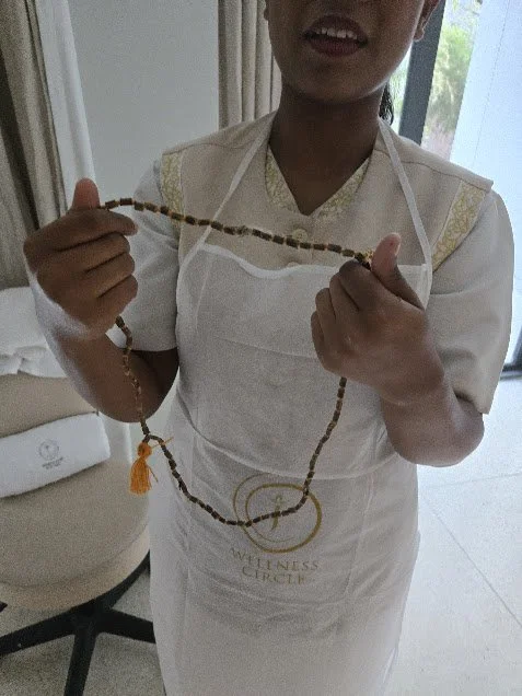 Before I left, Sibani placed a tulsi bead mala around my neck.
